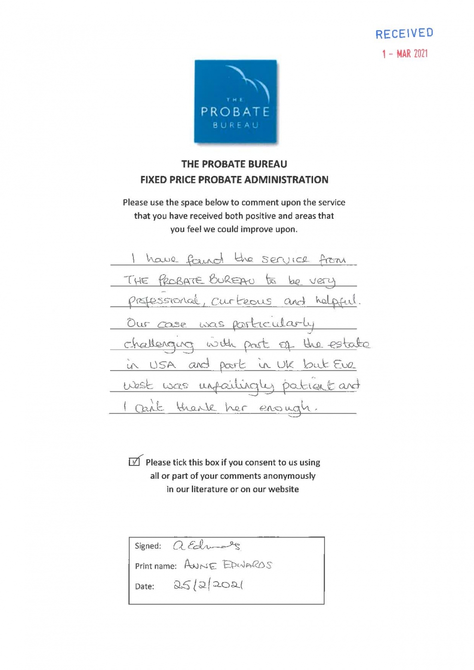 xxx and I want to express our thanks to you and your firm for all the work which you carried out for us in the administration of our mother's estate. We know it's your job and you do this all the time, but we felt we had to say how impressed we have been with the work The Probate Bureau do and in particular how you, yourself have dealt with us. nothing has been too much trouble and you have always taken time to talk, even though you must have many other people to deal with.